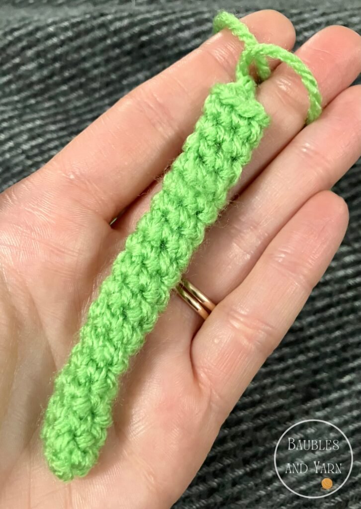 In orange with a 2.5 mm hook, ch 4. Sl st in 2nd ch from hook, (sl st, hdc, sl st) in the next st, sl st. Continuing on the other side of the starting ch, sc and 2 sl st along the top. Cut off leaving a tail for sewing.